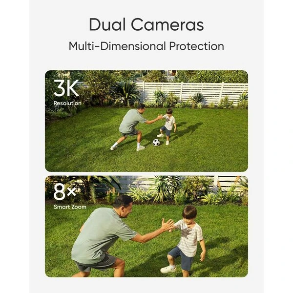 Телефото камерата улавя детайли от разстояние до 50 фута (15 м), докато широкоъгълната камера фокусира върху голямата картина в 3K резолюция. Двойните камери осигуряват до 8x цифрово увеличение.